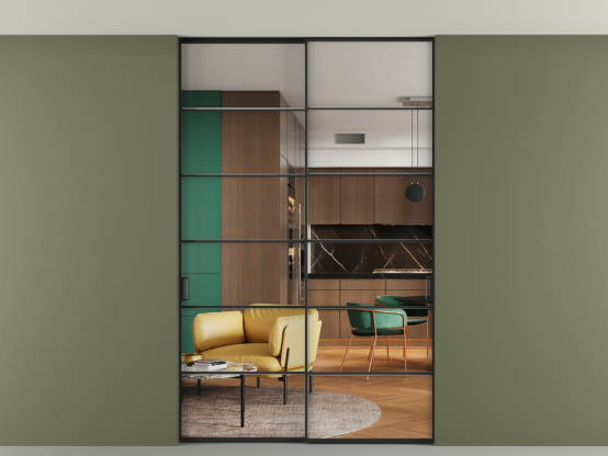 Алюминиевые перегородки имеют единый профиль с алюминиевыми дверьми и легко сочетаются в одном пространстве, не перегружая его. Также их можно комбинировать в интерьере с полотнами из нашего стандартного ассортимента. Помимо этого, система алюминиевых перегородок и дверей координируется со стеновыми панелями Волховец.